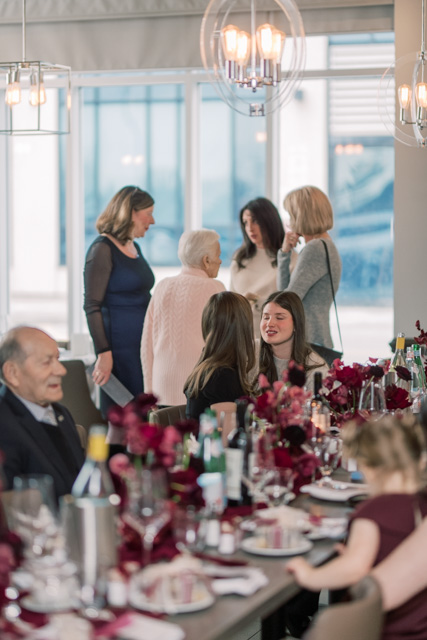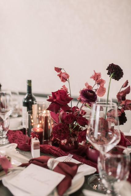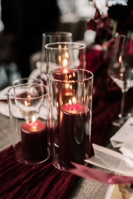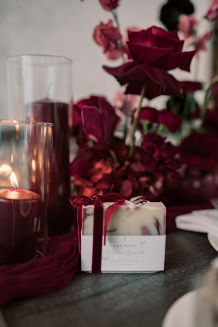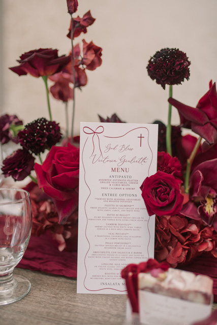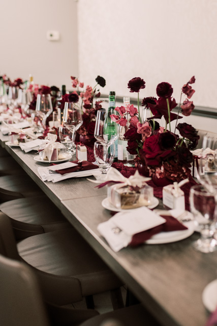 Christina has a natural eye for design, and her attention to detail elevated the entire celebration. The space was adorned with rich burgundy floral arrangements, soft candlelight, and layered textures that created a warm, refined atmosphere.