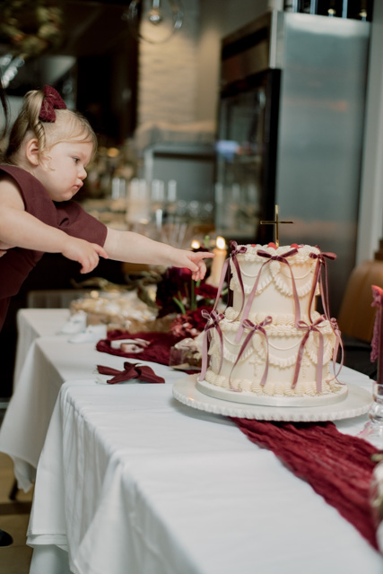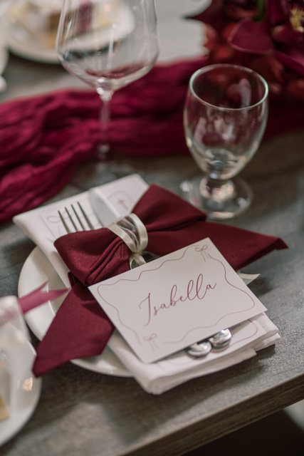 One of the most striking details was how guests embraced the vision. Family and friends arrived dressed in coordinating burgundy tones, creating a visually unified and intimate setting that photographed beautifully.